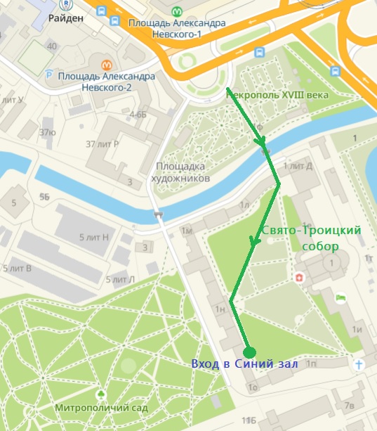 - Схема маршрута от ст. метро «Площадь Александра Невского-1», «Площадь Александра Невского-2» до места проведения мероприятия (Синий зал Епархиального управления). Время пешеходного маршрута от ст. метро до места проведения мероприятия – 10-12 мин. У входа в Александро-Невскую Лавру участников встречают волонтеры Движения Первых.